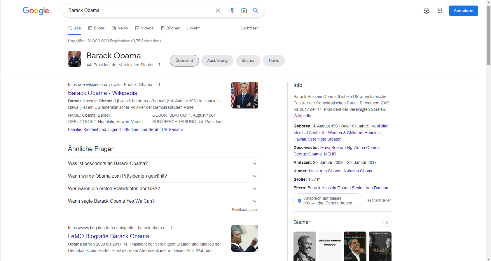 Google uses entities to give meaning and context to information on the internet. It does this by understanding the relationship between different pieces of information and using this knowledge to rank search results. For example, if you search for "Barack Obama", Google understands that you are looking for information about the 44th President of the United States. Google then shows you a knowledge panel, or entity boxes, with the most relevant results. For example, you get an overview with information about his term in office, his family, his biography and further questions that fit the topic. (see screenshot)